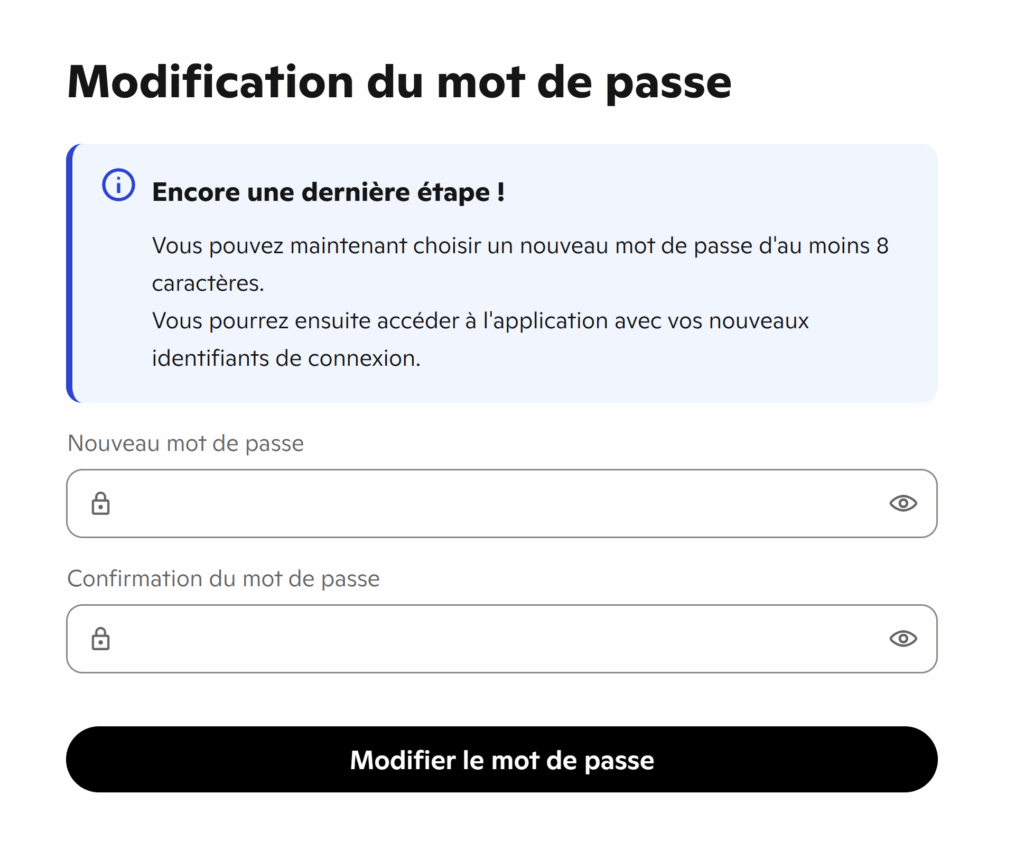 Enfin, vous êtes invité à choisir un nouveau mot de passe. Pour obtenir des conseils à ce sujet, visitez l’article Comment choisir un mot de passe sûr ?
