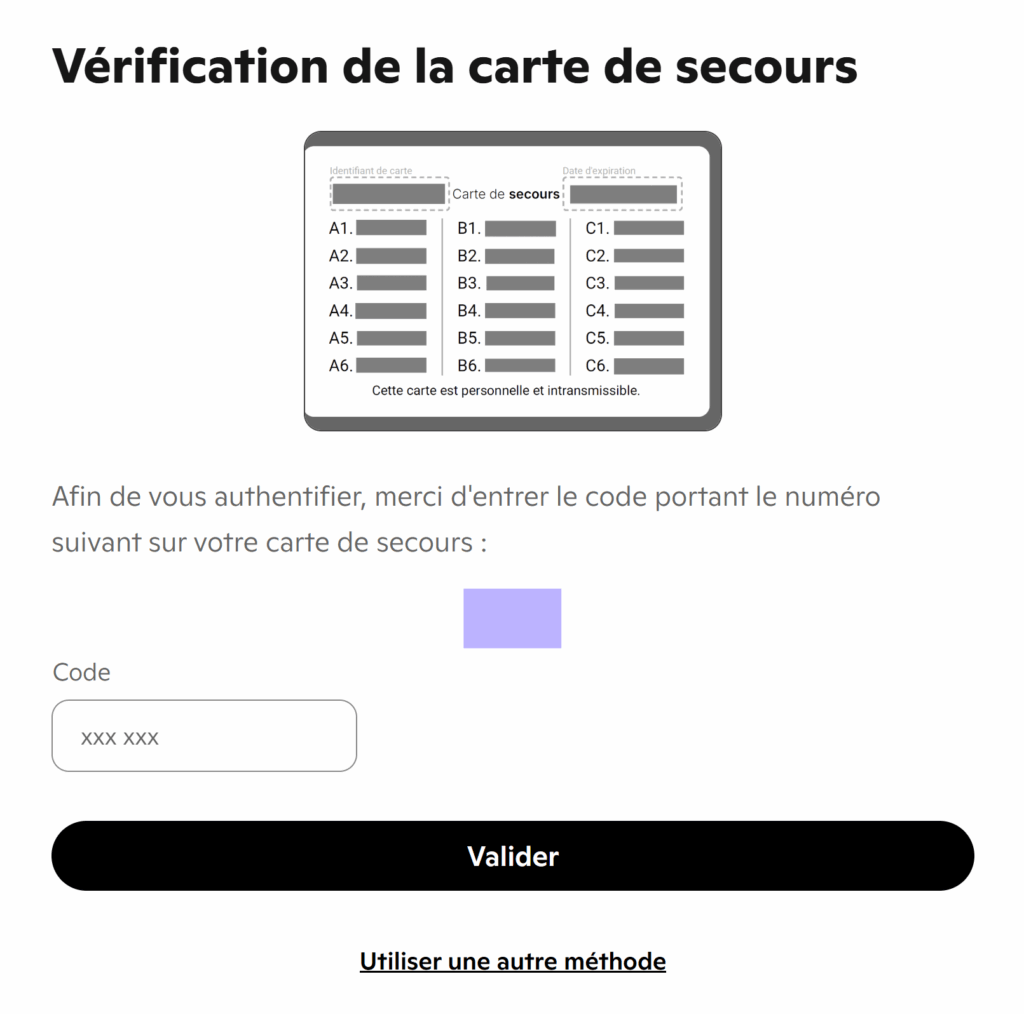 Il vous est ensuite demandé de recopier sur votre écran l’un des 18 codes à 6 chiffres affichés sur votre carte de secours, numérotés de A1 à C6.