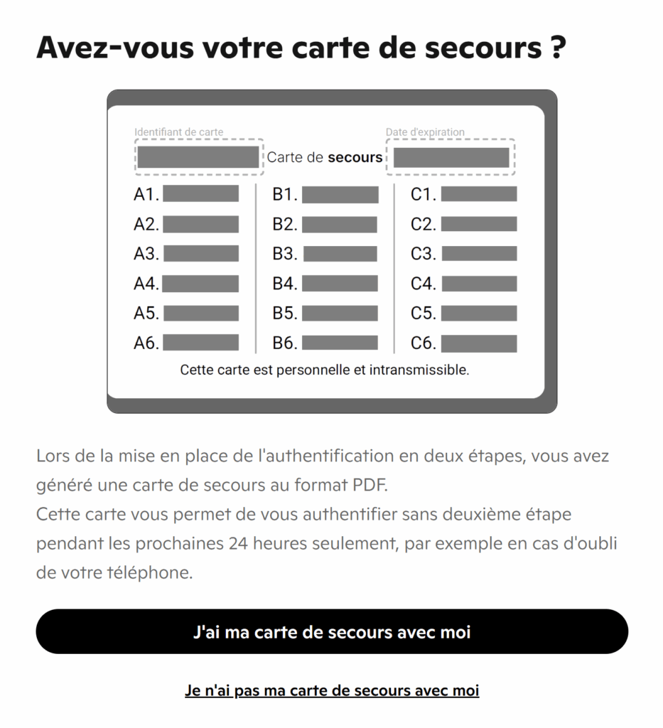 Si vous n’avez accès à aucune de ces méthodes, vous pouvez vous connecter temporairement grâce à votre carte de secours.